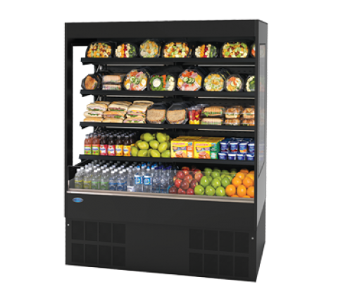 Refrigerated Self-Serve Slim-Line High Profile Specialty Merchandiser, 59-1/4"W x 24"D x 78"H, adjustable black metal shelves with price tag molding, (4) tier of shelves can be flat or slanted, top mounted LED light, choice of six standard laminates exterior, stainless steel display deck, black interior & glass end panels, front air Intake & discharge, night curtain, electronic temperature control with on-demand defrost, cord & plug, cULus, UL EPH Classified, Made In USA, DOE 2017 compliant