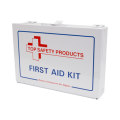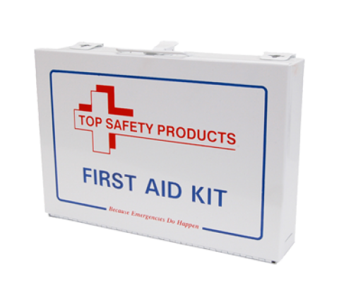 First Aid Kit, 25 Person, 10-7/8"L x 7-3/8"W x 2½"D, white metal outer case, box comes with hinged plates for optional wall mounting and collapsible handle includes: (1) Burn Cream - 1/2 oz Tube (1) Cold Pack (1) Combine Pad - 5" X 9" (1) Cotton Sterile - 1/2 0Z (1) Eye Irrigate Solution - 1 oz (1) First Aid Guide (1) Pair Nitrile Gloves (1) Pair Of Scissors (1) Pair Of Tweezers (1) Triangular Bandage (10) Alcohol Wound Wipes (12) Aspirin Tablets (2) Adhesive Tape Rolls - 1/2" X 2 1/2 Yd (2) Eye Pads (2) Gauze Bandages - 2" Wide Roll (2) Gauze Pads - 4" X 4" (3) Ammonia Inhalants (3) Sting Relief Wipes (4) Gauze Pads - 3" X 3" (48) 1" X 3" Adhesive Strips