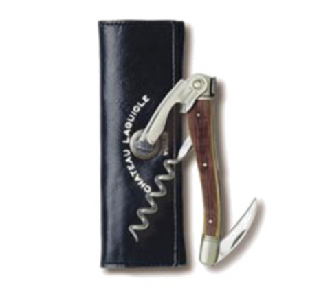 Chateau Laguiole® Waiter's Corkscrew, 4-1/2" overall length, spiral, forged serrated blade, rounded boot lever, oak barrel wood handle, includes: leather pouch, Made in France (factory box)