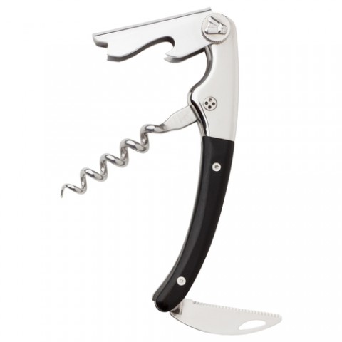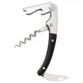 Clos Laguiole Waiter's Corkscrew, 5" overall length, elongated conical spiral, serrated blade, finger nail grip, bottle cap opener, (2) adjustable axis connections, black horn handle, includes: two-sided wrench, black leather sheath & box, Made in France (factory box)