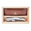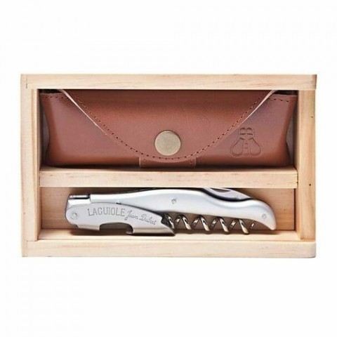 Laguiole Millesime®Waiter's Corkscrew Set, includes: (1) corkscrew- 4-3/4" overall length, spiral, serrated blade, ABS plastic handle, metallic, silver (3328), (1) 6-1/2"W x 4-1/4"D x 1-3/4"H wood box with clear acrylic sliding top (10-0200) and (1) 4-7/8"W x 2-1/4"D leather pouch with belt loop, Handmade in France (factory box)