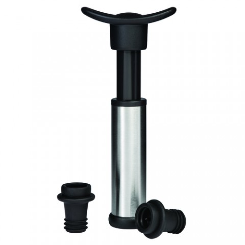 VinoVac™ Vacuum Wine Preservation, includes: (1) 3-1/4" x 1-1/4" x 5" stainless steel pump, (2) black stoppers (retail box)