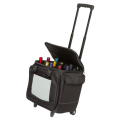 Wine/Champagne Travel Tote, (12) bottle capacity, 14-3/4"W x 11-1/2"D x 16-3/4"H, insulated, carry handle, adjustable shoulder strap, two-way locking zipper, removable 12-bottle separator inset, (2) side pockets, with hook and loop flap closures, (1) light gray front pouch, with added small pouches, double track rear rubber wheels, telescopic aluminum 2-step handle with push button, nylon, black (factory box)