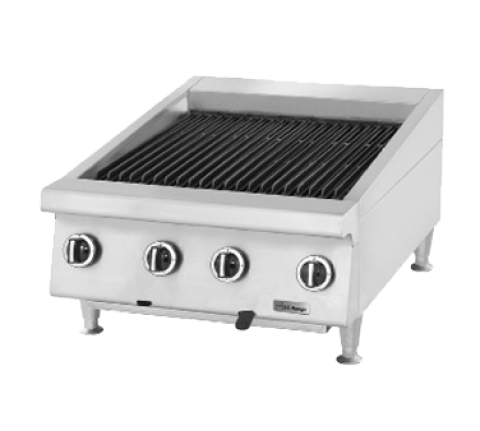 Charbroiler, countertop, gas, 48" W, heavy-duty, non-adjustable cast iron grates, 21-3/16” D broiling grid, (1) variable hi/lo valve per burner, manual controls, crumb tray, reversible cast iron broiler racks in 3” W sections, stainless steel front, sides, back & 3-1/2" front rail, 4" adjustable legs, 144,000 BTU (US Range), CSA, NSF