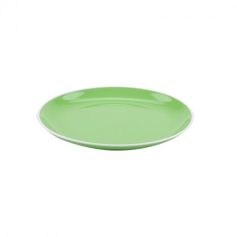 Settlement™ Oasis™ Dinner Plate, small, 9-1/2" dia., round, coupe, break-resistant, dishwasher safe, BPA Free, melamine, green apple with white trim, NSF (to be discontinued, contact factory for availability)