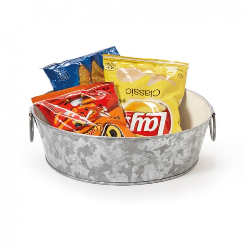Tray, 10-1/2" dia. x 3"H, round, with drop loop handles, hand-wash recommended, galvanized metal with ivory powder coated interior (to be discontinued, contact factory for availability)