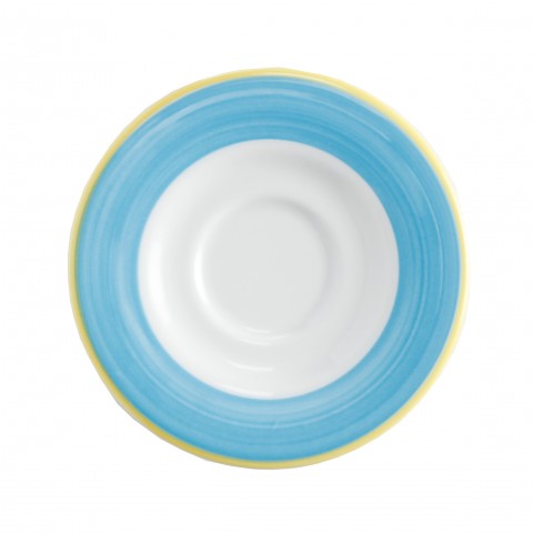 Tea/Bouillon Saucer, 6-1/2" dia., round, scratch/chip resistant, microwave, dishwasher & oven safe up to 380°F, porcelain, yellow edge, Corona, Calypso, Blue (Stocked Item)