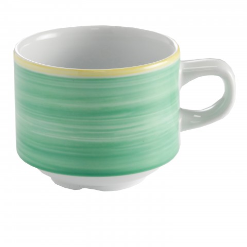 Espresso Cup, 2-9/10 oz., 3-3/4" dia., with handle, stackable, scratch/chip resistant, microwave, dishwasher & oven safe up to 380°F, porcelain, yellow edge, Corona, Calypso, Green (Made to Order item- 12 weeks lead time, minimum order = 42 dozen)