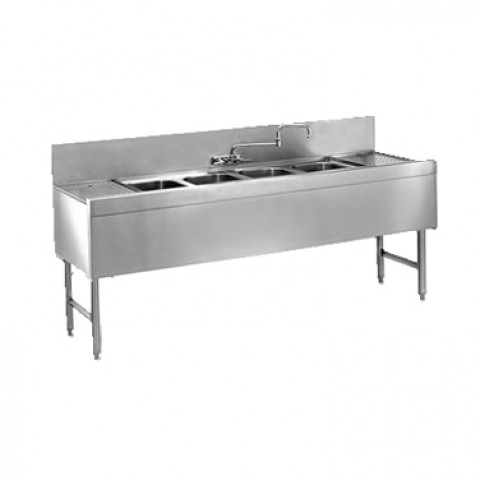 Underbar Sink Unit, four compartment, 60"W x 19"D, 11" wide x 14" front-to-back x 10-1/4" deep sink compartments, 12" drainboard on left with removable perforated insert, splash mount faucet (low lead compliant), includes (4) overflow standpipes, stainless steel construction, stainless steel legs with adjustable bullet feet, ETL-Sanitation (NOTE: Made to order, not returnable)