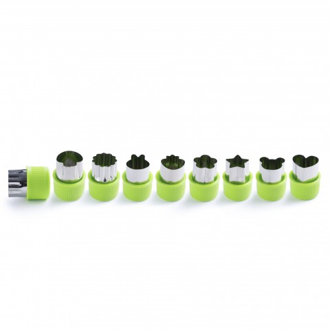 HIC Mini Fruit & Vegetable Cutter Set, 9-piece, includes (1) each star, heart, mushroom, bunny, flower, small fluted, strawberry, bear, & large fluted, stainless steel & polypropylene, BPA free