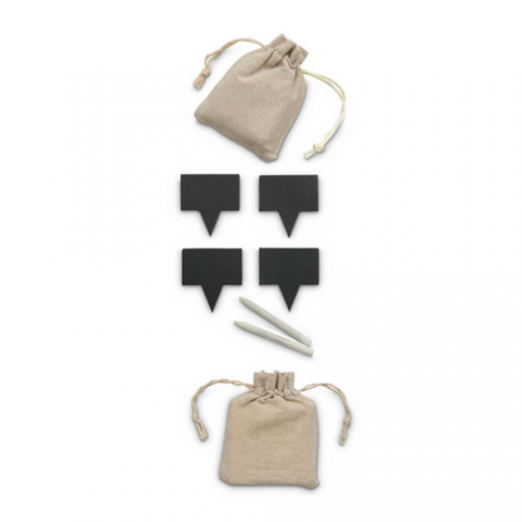 Maison du Fromage's Slate Cheese Markers Set, set includes (4) slate markers (2.16 x 2.36 x 0.23-inches), (2) soapstone pens (3.2 x 0.25 x 0.25-inches), and (1) linen storage bag (4.5 x 3.75-inches), slate markers and storage bag are hand washable