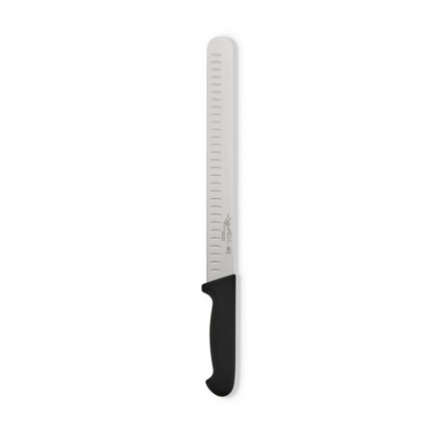 Slicer, 12", granton, stamped, German carbon steel (X50CrMov15) blade, black santoprene handle, NSF