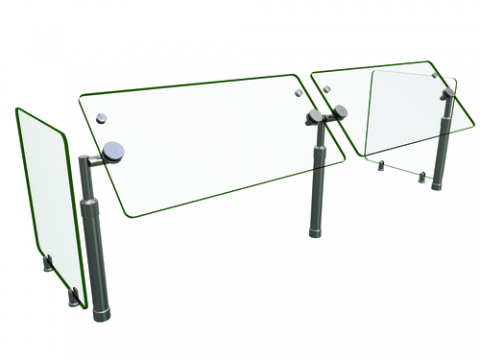 Flav-R-Shield® B950 Food Shield, adjustable self-service, 2 Bays 60"W x 18"D x 23"H, heat tempered glass construction throughout with 3/4" radius corners and polished edges, 3/8" thick glass front and side panels, 1" OD brushed 304 stainless steel posts, adjustable Face Panel rotation in 15-degree increments, NSF component, Made in the USA