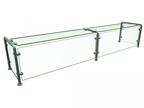 Flav-R-Shield® EP12 Food Shield, full service pass-over, 2 Bays 84"W x 18"D x 18"H, 1/4" thick heat tempered glass construction throughout with 3/4" radius corners and polished edges, glass top shelf, front and side panels with back posts, 1" OD brushed 304 stainless steel posts, NSF component, Made in the USA