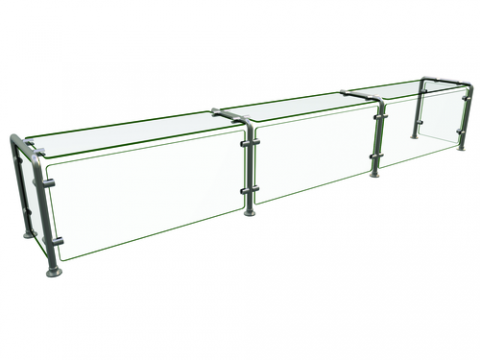 Flav-R-Shield® EP12 Food Shield, full service pass-over, 3 Bays 96"W x 15"D x 18"H, 1/4" thick heat tempered glass construction throughout with 3/4" radius corners and polished edges, glass top shelf, front and side panels with back post, 1" OD brushed 304 stainless steel posts, NSF component, Made in the USA