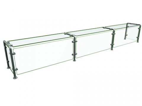 Flav-R-Shield® EP12 Food Shield, full service pass-over, 3 Bays 108"W x 15"D x 18"H, 1/4" thick heat tempered glass construction throughout with 3/4" radius corners and polished edges, glass top shelf, front and side panels with back posts, 1" OD brushed 304 stainless steel posts, NSF component, Made in the USA