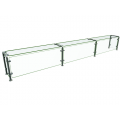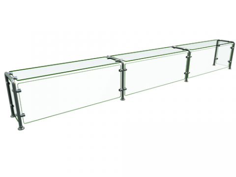 Flav-R-Shield® EP12 Food Shield, full service pass-over, 3 Bays 120"W x 12"D x 18"H, 1/4" thick heat tempered glass construction throughout with 3/4" radius corners and polished edges, glass top shelf, front and side panels with back post, 1" OD brushed 304 stainless steel posts, NSF component, Made in the USA