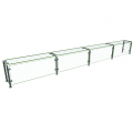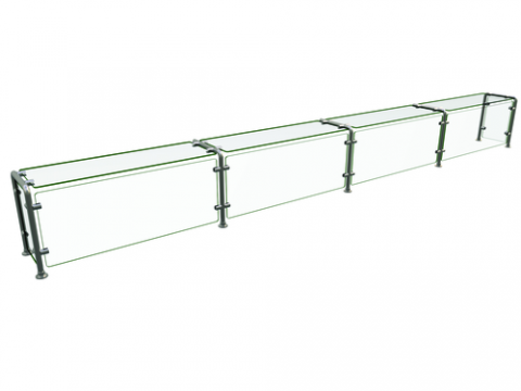 Flav-R-Shield® EP12 Food Shield, full service pass-over, 4 Bays 144"W x 12"D x 18"H, 1/4" thick heat tempered glass construction throughout with 3/4" radius corners and polished edges, glass top shelf, front and side panels with back post, 1" OD brushed 304 stainless steel posts, NSF component, Made in the USA