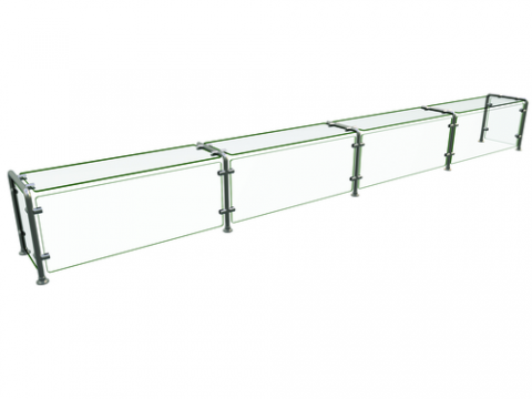 Flav-R-Shield® EP12 Food Shield, full service pass-over, 4 Bays 144"W x 15"D x 18"H, 1/4" thick heat tempered glass construction throughout with 3/4" radius corners and polished edges, glass top shelf, front and side panels with back posts, 1" OD brushed 304 stainless steel posts, NSF component, Made in the USA