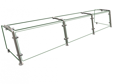 Flav-R-Shield® EP21 Food Shield, full service pass-over, 3 Bays 96"W x 18"D x 18"H, 1/4" thick heat tempered glass construction throughout with 3/4" radius corners and polished edges, glass top shelf, front and side panels, 1" OD brushed 304 stainless steel posts, front posts tilted back to an 80 degree angle, NSF component, Made in the USA