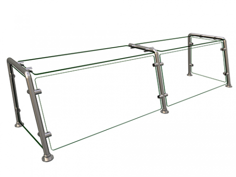Flav-R-Shield® EP22 Food Shield, full service pass-over, 2 Bays 60"W x 15"D x 18"H, 1/4" thick heat tempered glass construction throughout with 3/4" radius corners and polished edges, glass top shelf, front and side panels with back posts, 1" OD brushed 304 stainless steel posts, front posts tilted back to an 80 degree angle, NSF component, Made in the USA