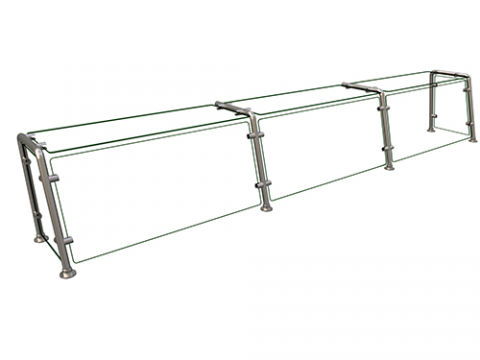 Flav-R-Shield® EP22 Food Shield, full service pass-over, 3 Bays 96"W x 12"D x 18"H, 1/4" thick heat tempered glass construction throughout with 3/4" radius corners and polished edges, glass top shelf, front and side panels with back posts, 1" OD brushed 304 stainless steel posts, front posts tilted back to an 80 degree angle, NSF component, Made in the USA