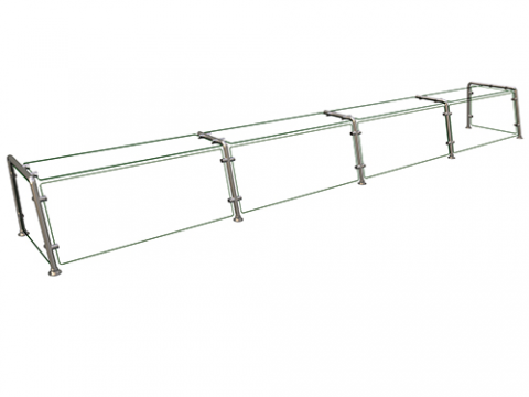 Flav-R-Shield® EP22 Food Shield, full service pass-over, 4 Bays 144"W x 18"D x 18"H, 1/4" thick heat tempered glass construction throughout with 3/4" radius corners and polished edges, glass top shelf, front and side panels with back posts, 1" OD brushed 304 stainless steel posts, front posts tilted back to an 80 degree angle, NSF component, Made in the USA