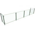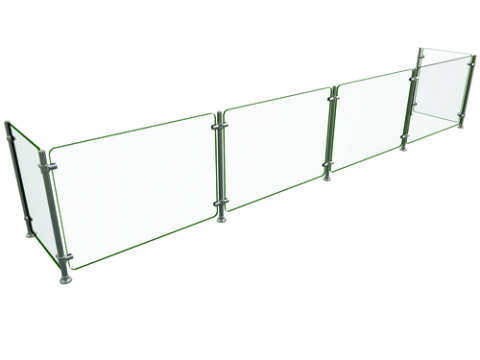 Flav-R-Shield® EP5-RING Food Shield, full service pass-over, 4 Bays 132"W x 18"D x 25"H, heat tempered glass construction throughout with 3/4" radius corners and polished edges, 1/4" thick glass front and side panels, 1" OD brushed 304 stainless steel post, adjustable ring brackets with locking points every 15 degrees, 2 x 18" deep glass end panels, NSF component, Made in the USA