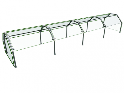 Flav-R-Shield® ES82 Food Shield, double-sided self-service, 4 Bays 132"W x 38"D x 23"H, 3/8" thick heat tempered glass construction throughout with 3/4" radius corners and polished edges, glass top shelf, front and back panels, side panels, 1" OD brushed 304 SS posts, NSF component, Made in the USA