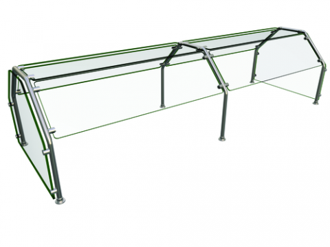 Flav-R-Shield® ES82 Food Shield, double-sided self-service, 2 Bays 84"W x 38"D x 23"H, 3/8" thick heat tempered glass construction throughout with 3/4" radius corners and polished edges, glass top shelf, front and back panels, side panels, 1" OD brushed 304 SS posts, NSF component, Made in the USA