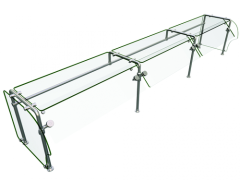 Flav-R-Shield® ES90 Food Shield, self-service, 120"W x 24"D x 22.63"H, heat tempered glass construction throughout with 3/4" radius corners and polished edges, 3/8" thick glass top shelf, adjustable front panel and side panels, 1" OD brushed 304 stainless steel posts, NSF component, Made in the USA