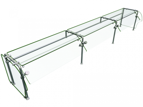 Flav-R-Shield® ES90 Food Shield, self-service, 132"W x 24"D x 22.63"H, heat tempered glass construction throughout with 3/4" radius corners and polished edges, 3/8" thick glass top shelf, adjustable front panel and side panels, 1" OD brushed 304 stainless steel posts, NSF component, Made in the USA