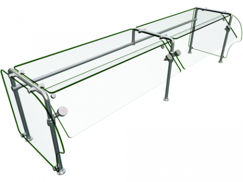 Flav-R-Shield® ES90 Food Shield, self-service, 84"W x 24"D x 22.63"H, heat tempered glass construction throughout with 3/4" radius corners and polished edges, 3/8" thick glass top shelf, adjustable front panel and side panels, 1" OD brushed 304 stainless steel posts, NSF component, Made in the USA