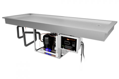 Drop-In Slim Frost Top, 54-15/16"L, accommodates (2) full size sheet pans, lighted on/off rocker switch, electronic adjustable temperature control can be mounted to either side of condensing unit or remotely up to 4' from unit, auto-defrost, 1" NPT drain, self-contained refrigeration, R-290, 1/4 HP, cULus, Made in USA