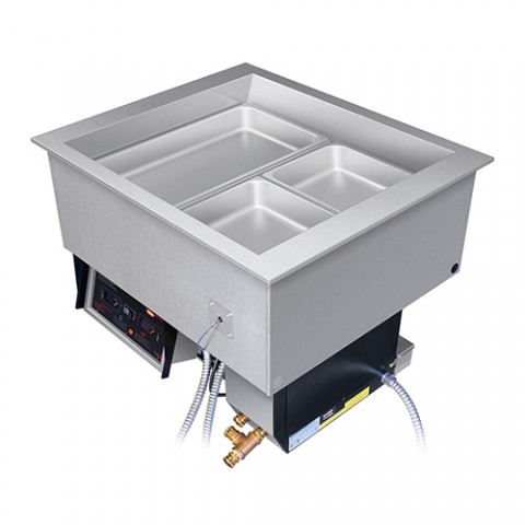 Drop-In Hot/Cold Well, accommodates (2) full-size pans, NO condensing unit, FR2 hydro-heater, TXV valve, remote mountable panel, 60" power supply whip, electronic temperature control, auto defrost, automatic water fill, condensing unit, comes with pan support bars, 3000 watts, 1/5 HP, cULus, Made in USA