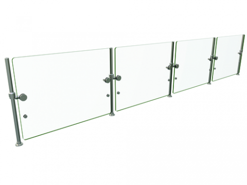 Flav-R-Shield® ORBIT100 Food Shield, full service pass-over, 4 Bays 132"W x 2"D x 18"H, heat tempered glass construction throughout with 3/4" radius corners and polished edges, adjustable 3/8" thick front panel with roatating face panel and additional circular openings for optimum high adjustment, 1" OD brushed 304 stainless steel posts with mounting feet, NSF component, Made in the USA