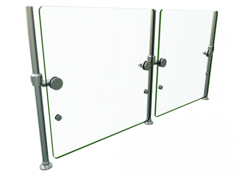 Flav-R-Shield® ORBIT100 Food Shield, full service pass-over, 2 Bays 48"W x 2"D x 18"H, heat tempered glass construction throughout with 3/4" radius corners and polished edges, adjustable 3/8" thick front panel with roatating face panel and additional circular openings for optimum high adjustment, 1" OD brushed 304 stainless steel posts with mounting feet, NSF component, Made in the USA