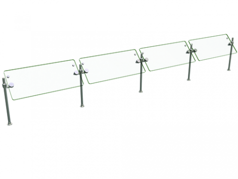 Flav-R-Shield® ORBIT360 Food Shield, self service, 4 Bays 132"W x adjustable 2-14"D x 23"H, heat tempered glass construction throughout with 3/4" radius corners and polished edges, adjustable 3/8" thick front panel with roatating face panel and additional circular openings for optimum high adjustment, 1" OD brushed 304 stainless steel posts with mounting feet, NSF component, Made in the USA