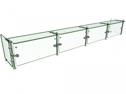 Flav-R-Shield® ORBIT900 Food Shield, full service, 4 Bays 132"W x 24"D x adjustable up to 23"H, 3/8" thick heat tempered glass construction throughout with 3/4" radius corners and polished edges, glass top shelf, front and side panels, 1" OD brushed 304 stainless steel posts, NSF component, Made in the USA