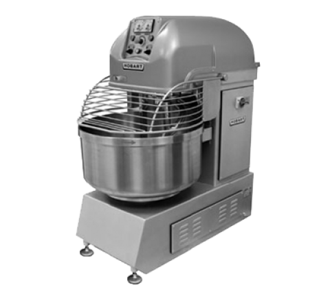 Hobart Spiral Mixer, 6.0 HP spiral motor & .75 HP bowl motor, 180-pound capacity, two fixed speeds with dual 20 minute timers plus a reverse speed & Jog Control feature. Has an extra pulley & strong SS spiral dough hook, 208v/60/3
