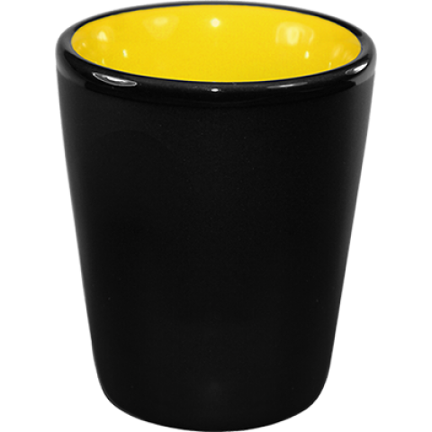 Shot Cup, 1-1/2 oz., 2" dia. x 2-1/4"H, round, without handle, fully vitrified, microwave & dishwasher safe, lead free, fully vitrified, stoneware, black matte exterior, yellow interior, Hilo®