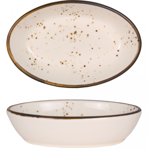 Splash™ Oven Baker, 6-3/8"L x 4-1/4"W x 1-5/8"H, 10 oz., oval, stoneware fully vitrified; crème with dark brown reactive glaze trim & speckles