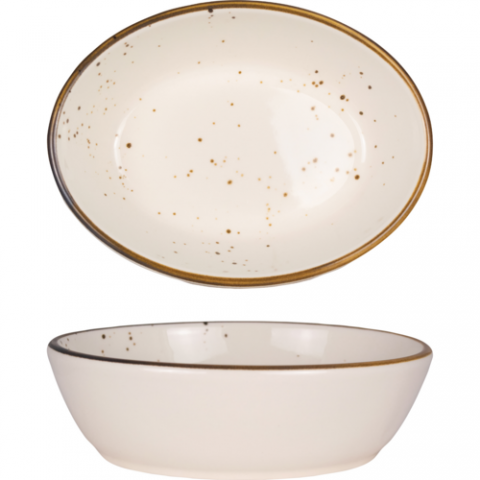 Splash™ Oven Baker; 6-7/8"L x 5-1/4"W x 2-1/8"H, 14 oz., oval, stoneware fully vitrified, crème with dark brown reactive glaze trim & speckles