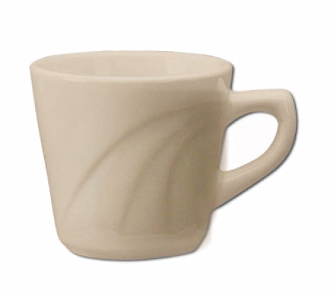 Cup, tall, 6-1/2 oz., 3" dia. x 3"H, round, with handle, embossed, rolled edge, highly polished foot, microwave & dishwasher safe, lead free, ceramic, American White, York™