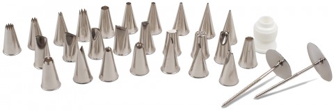 Pastry Tip Set, includes: (1) plastic storage box, (26) assorted tubes, (2) flower nails, and (1) plastic coupling, stainless steel tubes