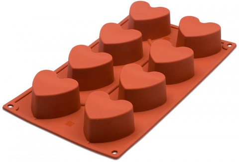 Pavoni Mold, 12"L x 7"W, (8) heart, 2-1/2"W x 1-1/3"H with 2 oz. capacity each, temperature range -10° to +500°F, non-stick, dishwasher safe, flexible, silicone, orange