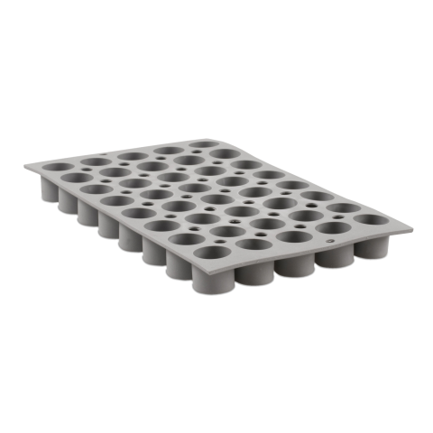 De Buyer Elastomoule® Mold, 12"L x 7"W, (40) mini cylinder, 1" dia. x 1"H with 1 oz. capacity each, temperature range -90° F to +580° F, non-stick, flexible, silicone, gray