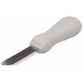 Oyster Knife. 3" blade, new have style, curved tip, stainless steel, white plastic handle, Made in USA, NSF