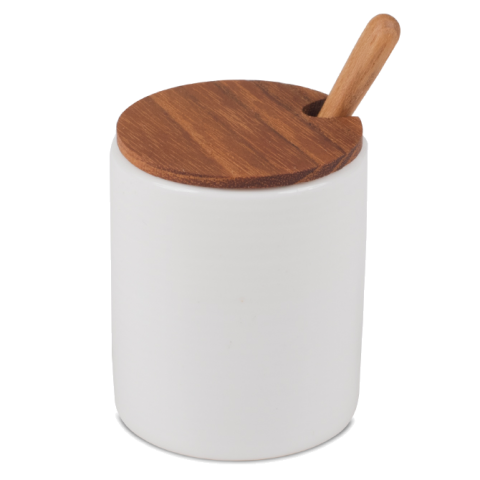 Mini Cellar, 1-3/4" x 2-1/4"H, round, with teak lid and spoon (3-1/4"L), ceramic, white