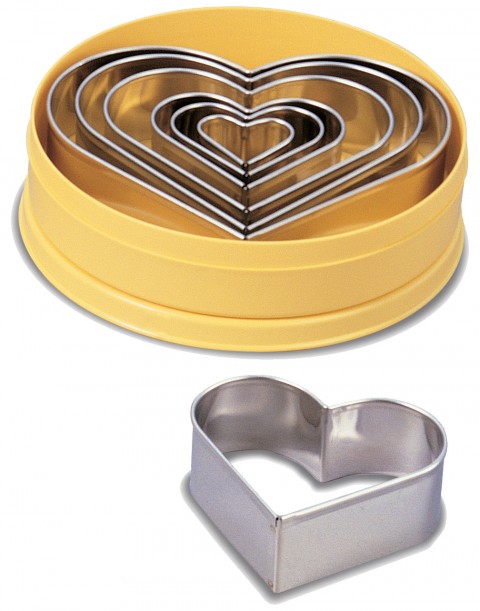 Pastry Cutter Set, 1-1/8"H, cut size range 1-1/4"W to 5-1/2"W, heart shaped, stainless steel, yellow plastic box (7 pieces per set)